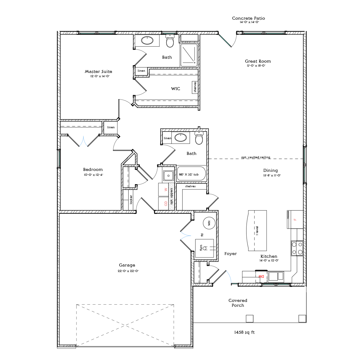 1458 SF 2 bedroom patio home with 2 car attached garage. Very open floor plan with master suite and front covered porch.